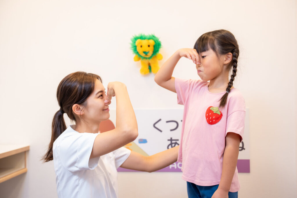 | トレーニングの重要性 | マイオブレース治療では、マウスピースの装着だけでなく、トレーニングの継続が非常に大切です。 筋肉の使い方が正しくなることで、歯や顎にかかる力のバランスが整い、口呼吸・低位舌・悪い姿勢の改善へとつながります。こうした積み重ねが、永久歯が自然に並ぶ理想的な環境をつくります。 |
